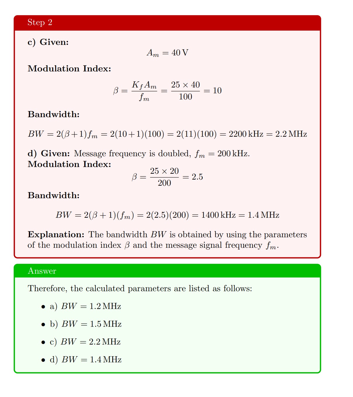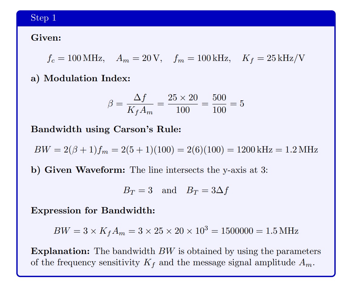 carrier wave of frequency 100MHz is frequency-modulated by a sinusoidal wave of amplitude 20V and frequency of 100kHz. The frequency sensitivity of the modulator is 25kHz/V. (a) Determine the approximate bandwidth of the FM wave using Carson’s rule. (b) Determine the bandwidth obtained by transmitting only those side frequencies with amplitudes that exceed student submitted image, transcription available below a question and you will be sure to find an answer!