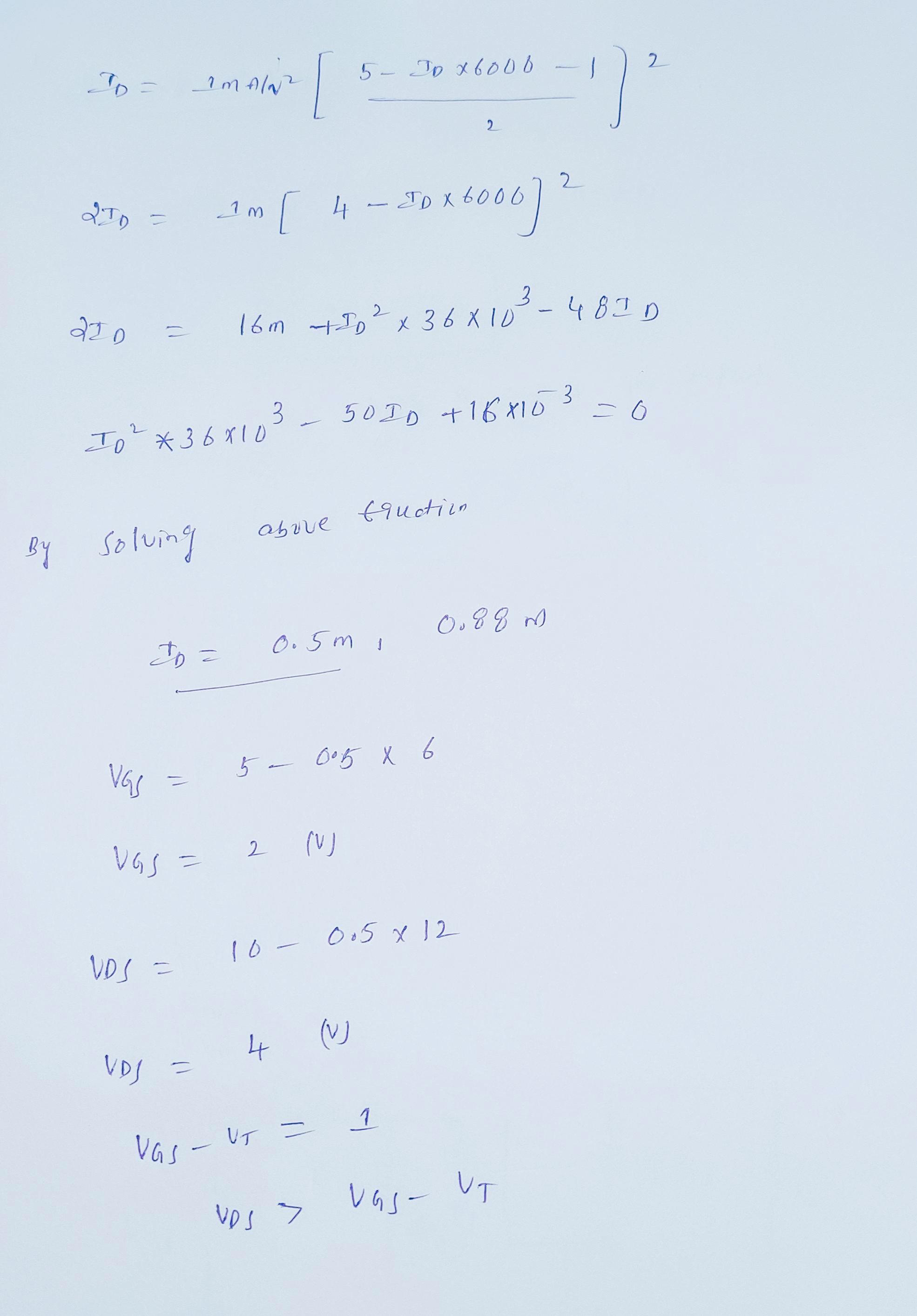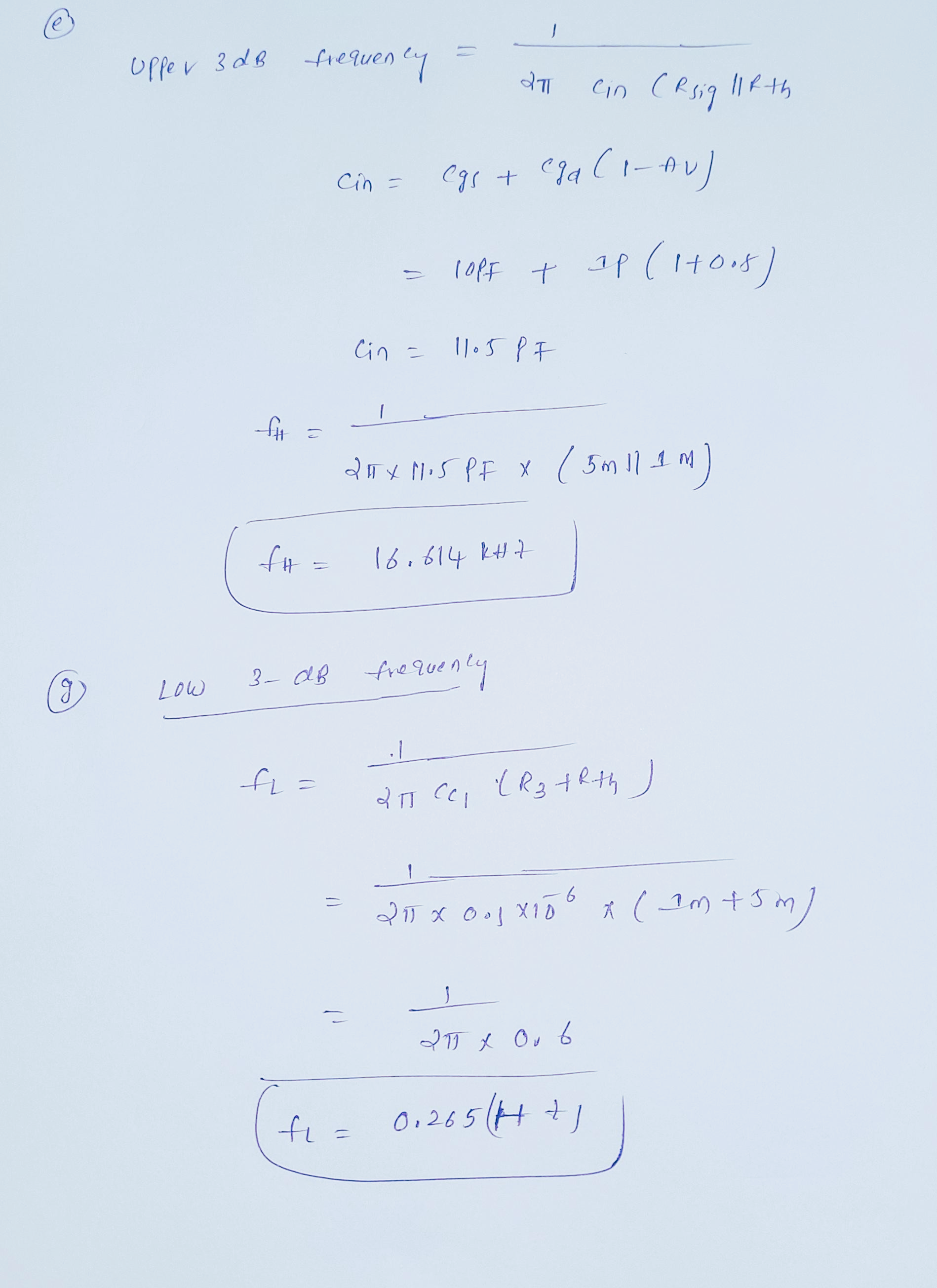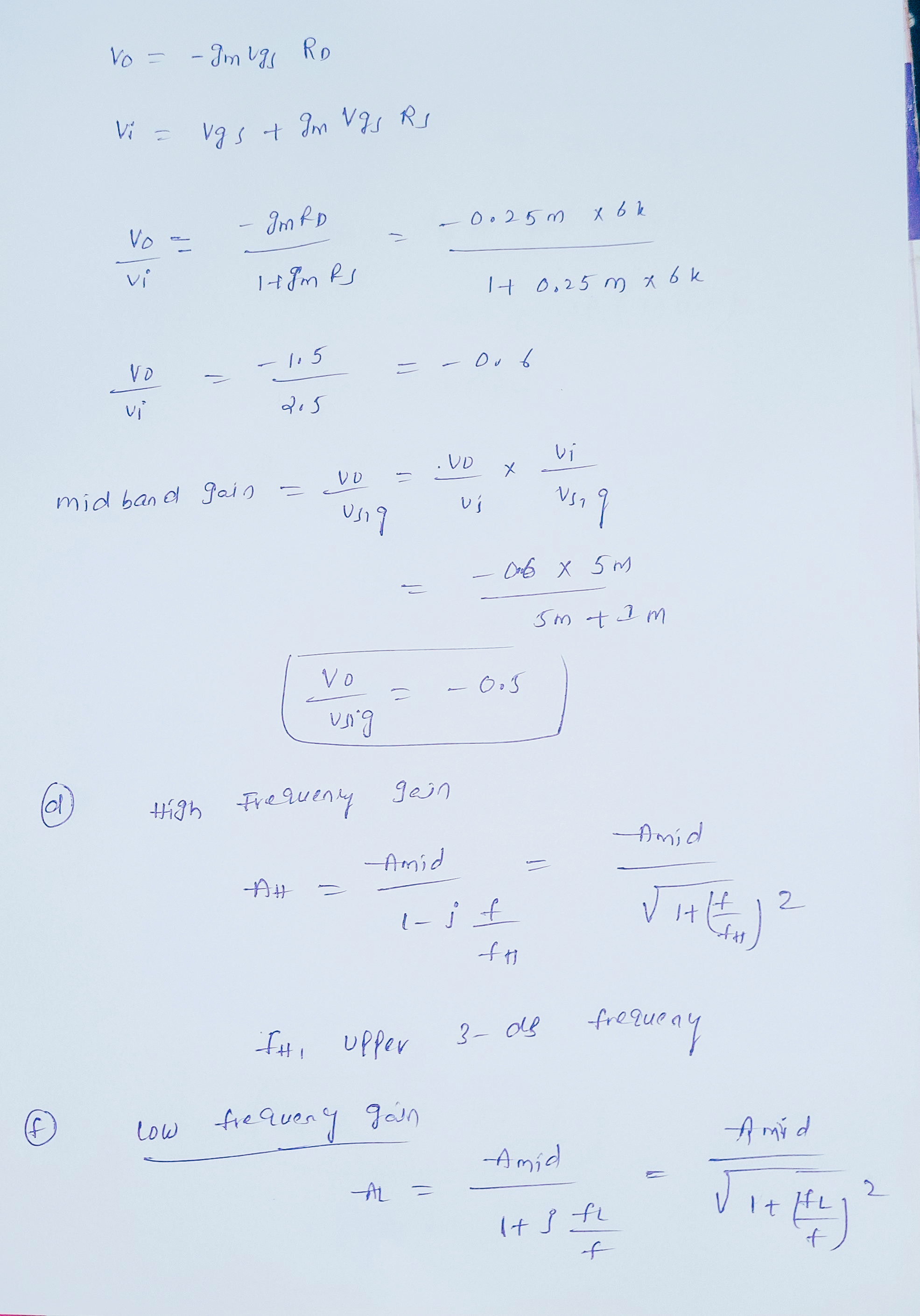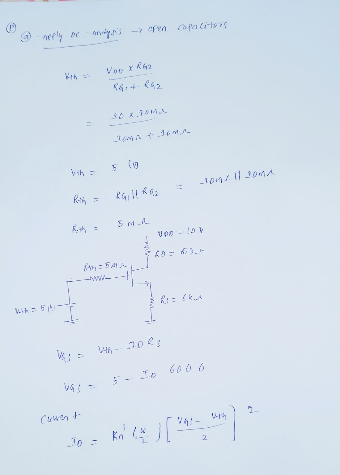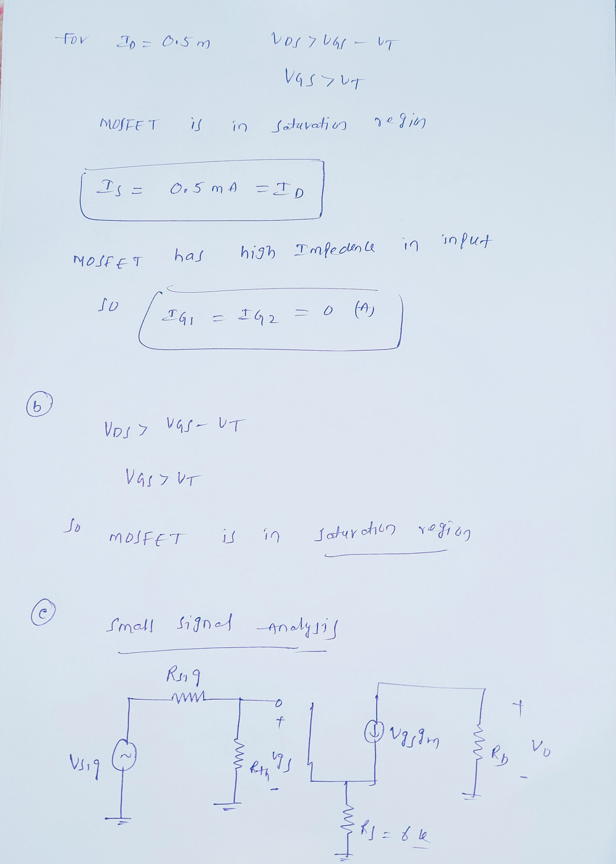 For the circuit shown in the figure below, Vt = 1 V and kn ′ (W/L) = 1 mA/ V2, VDD = 10 V,RG1 = RG2 = 10 MΩ, RD = Rs = 6 KΩ, Rsig = 1MΩ, Cc1 = 0.1μF, Cgs = 10 pF Cgd = 1 pF. Neglect the channel length modulation effect (i.e., assume λ = 0).Find:a) Missing Current Values IG1, IG2, ID and IS.b) Classify which operation region the Amplifier is operating.c) The midband Gain .d) The high frequency gain.e) Find the upper 3-dB frequency.f) Find the low frequency gain.g) Find the low 3-dB frequency. |