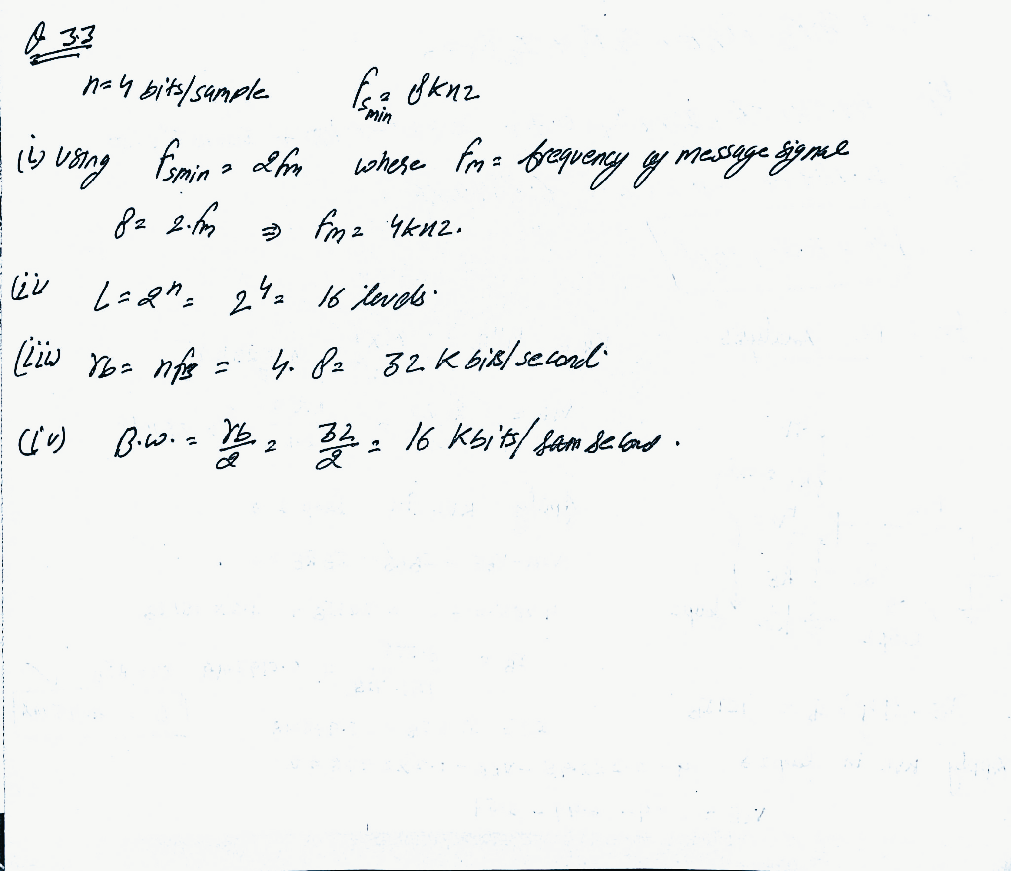 The PCM samples are encoded into a 4-bits system. If the minimum sampling rate used is 8kHz, calculate a) The quantization level. b)the transmission rate(2 sample’s) c) The transmission bandwidth 2- Let us consider an example that relates the Nyquist and Shannon formulations. Suppose that the spectrum of a channel is between 3 MHz and 4 MHz and SNR = 24DB